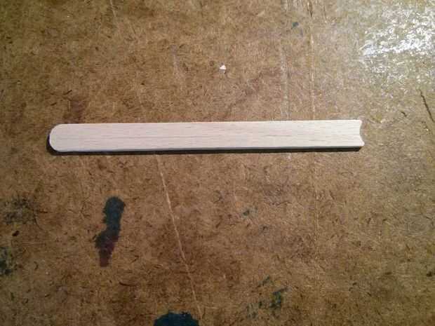 Para preparar el lanzamiento, comienza por cortar una forma cóncava en el extremo del palito, como se muestra. Esto es donde la goma se sentará cuando el arma está cargada. Esto se puede hacer con un cortador de caja (extremar - cortar madera con un cúter, particularmente un corte redondo como este, puede causar lesiones horrible, horrible, desagradable y sangrienta porque es propenso a deslizarse apagado el material), o con más seguridad puede acercarse con algo como una lijadora de tambor pequeño en una herramienta Dremel. O una lima redonda. Hay múltiples maneras de hacerlo.
