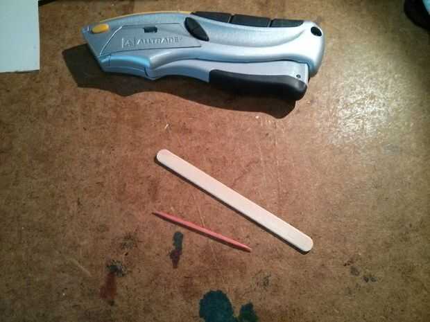 Cuando termine, cortar la paleta cerca de 2/5 del camino hacia el otro extremo del palillo. La pieza más grande será el gatillo. En él se corte una muesca como se muestra en la imagen. Un cortador de la caja funciona muy bien para esto como cortado a contrapelo primero - de lo contrario dividirá tu stick. La ranura puede y probablemente debe ser más grande que lo que se ve en la foto, aunque (y de hecho éste fue ampliado un poco antes de la construcción se completó).