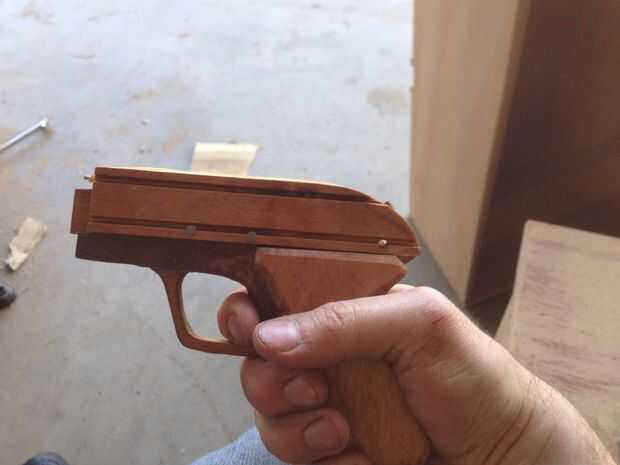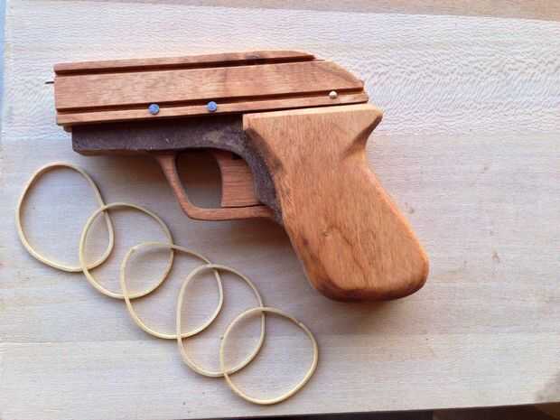aquí hay algunas pistolas de goma muy fácil que se pueden hacer en menos de 5 minutos. En primer lugar trazar su arma en un pedazo de madera que es 1/2 pulgadas de espesor. Luego córtelo hacia fuera en una sierra de contornear. Recuerde cortar una V