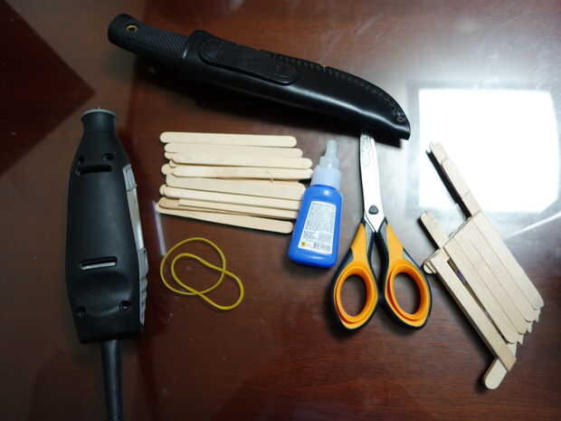 Para este proyecto, se necesita lo siguiente: super herramienta dremel (un conjunto de archivos hará), bandas de goma, glue(recommended), aproximadamente 25 ~ 30 palitos, un par de tijeras o un cuchillo pequeño.