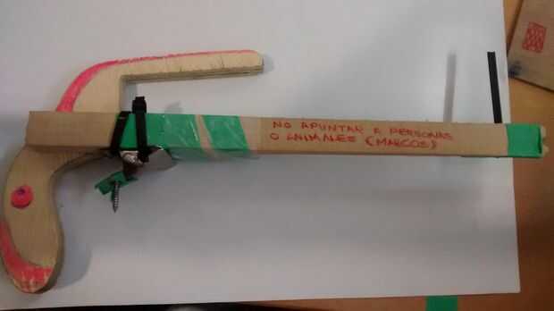 Una pistola de goma simple hecha con una clavija de ropa, regla (preferiblemente de madera), cinta adhesiva, dos chinchetas y una banda de caucho.Paso 1: Cómo empezar Inicio insertar un dedo pulgar de la tachuela en el extremo de la regla.Paso 2: sig
