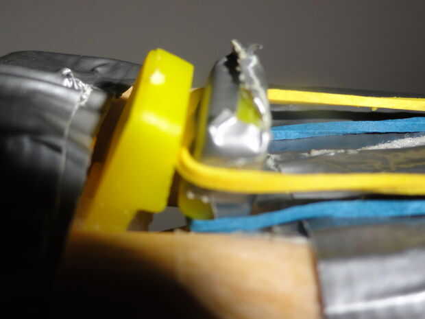 Obtener la última pieza de madera con la v en la punta y ponerlo entre el barril con madera, pero la v está frente al revés hacia el lado de la goma va a disparar hacia fuera y cinta adhesiva pero recuerde dejar espacio para que usted puede tirar del gatillo. Disfrute de