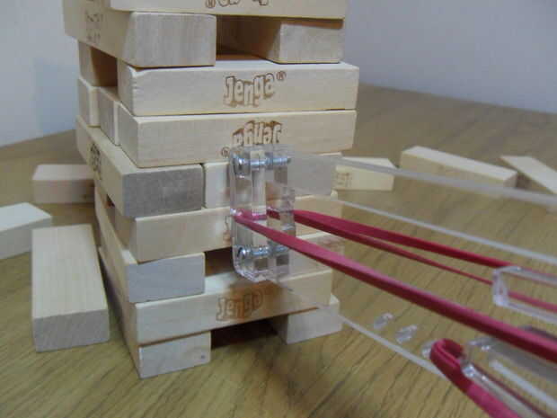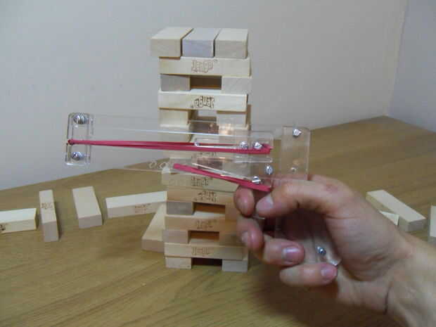 Jenga, el clásico juego de madera de habilidad, suerte y equilibrio, donde los jugadores turnan para prod, empujar y tirar de un bloque de la pila sin derribarlo.Ahora, ¿qué podría ser más divertido que Jenga? Jenga con armas!Este láser pistola Jenga