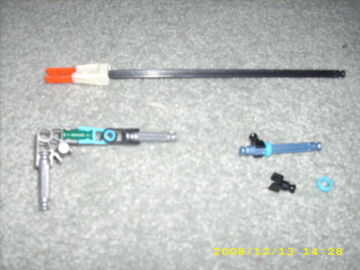 Poner el conector marrón (naranja) en la barra del negro (gris), y luego clip el conector azul pequeño verticalmente delante de él (ver imagen). Únalos con cinta adhesiva. El gatillo debe ser fácil de construir de los cuadros.