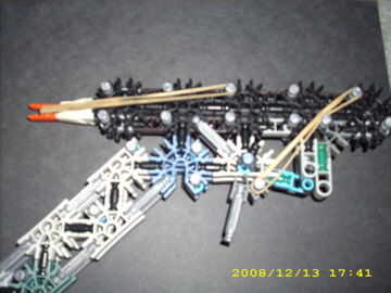 Si utilizas todas las bandas de media, atar juntos 2. Poner el nudo de esta banda o el centro de la banda ancha en el clip marrón (naranja) y fije los extremos a cualquiera o las barras en el barril (la tercera funciona para mí). La otra banda mantiene el gatillo.