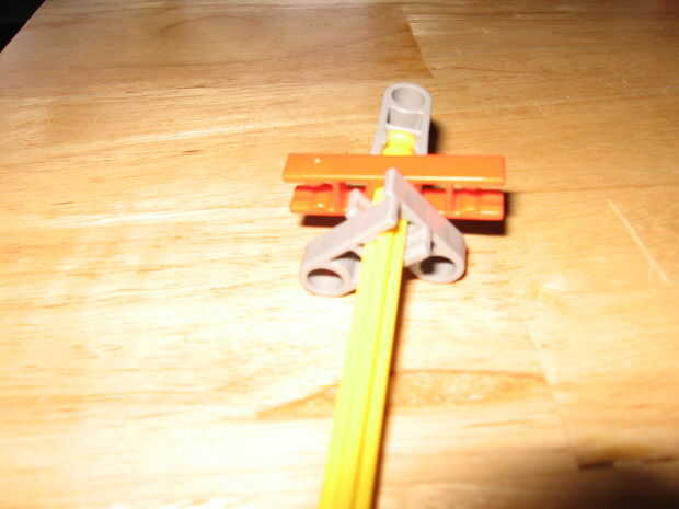 Varilla amarilla con una tapa gris, esto es lo que el caucho bandas pasarán a través. Conector naranja es lo que tire. No es necesario, pero facilita la extracción. Luego dos gris conectores de extremo apuntando en ángulo que la barra en lugar. Estos serán alimentados en las piezas grises en el cañón