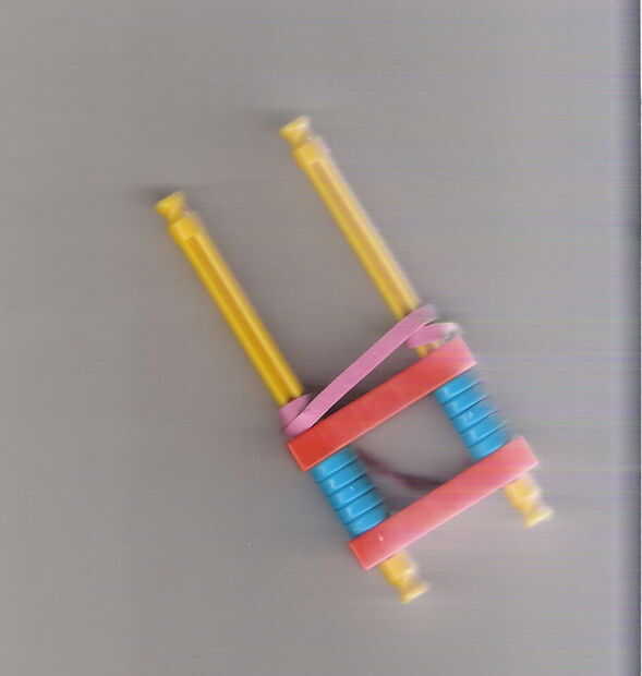 tomar los 2 amarillos enfermos y en cada puesto 5 arandelas azul. Poner las 2 piezas naranja delante y detrás de las arandelas como en la foto. Empuje las arandelas y los clips tan lejos como sea posible. Envuelva la cinta de goma alrededor de él como él en la foto.