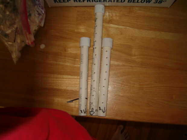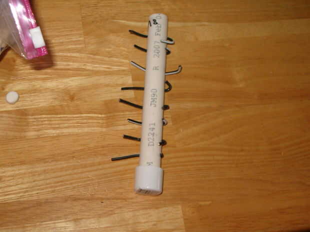 todo bien ahora hacer agujeros sobre 3\4s de una pulgada aparte a través de ambos lados (obviamente). ahora corte el cable 2 1\2 pulgadas segmentos. ahora su hecho. Asegúrese de que usted deje una separación de los agujeros de la tapa en el extremo y la pieza de salida de la pistola en la parte inferior.