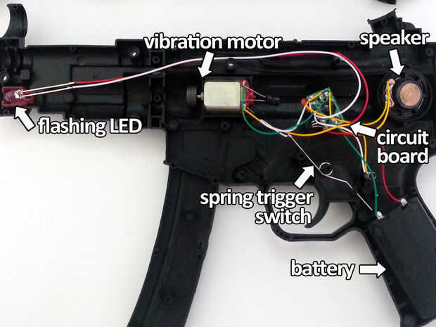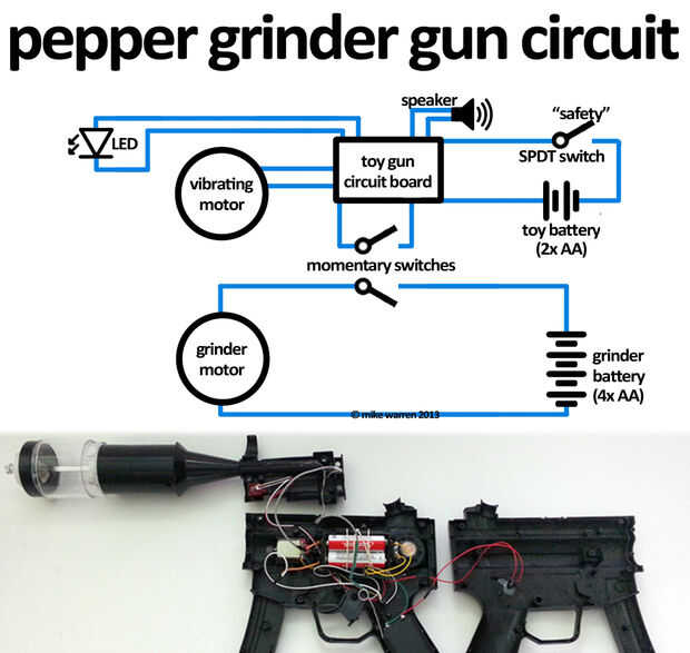 La idea es utilizar la electrónica existente de juguete y combinarlo con un molinillo de pimienta eléctrico. Aquí está el circuito terminado