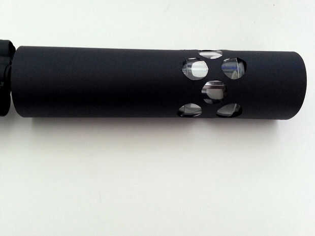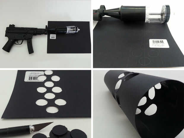 He comprado un A4 (8.5 "x 11") hoja de mate negro cartulina y colocar el silenciador grinder a lo largo de la parte superior del lado largo del papel. Saqué algunas pautas con un lápiz y una regla. Luego utilicé un cuarto como plantilla y trazó un desvío patrón de círculos a lo largo de donde sería envolver el acrílico claro de la tolva del molino, esto permitirá elight th que nos mudamos dentro de la tolva que se demostrará a través del protector de boca. Un cuchillo de la manía aguda fue utilizado para cortar los círculos.