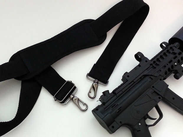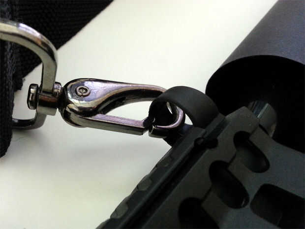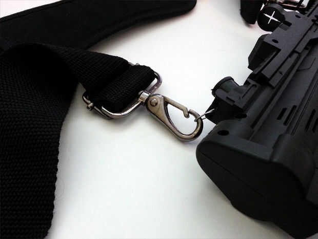 El clip de correa fue conectado en la abertura de la mira delantera y en el talón del juguete. Mi juguete no tenía un lugar para la correa en el talón, así perforé una pequeña abertura la una zona clara de la electrónica y pasaron un clip doblado a través de algunos tiempos para hacer un anillo doble.