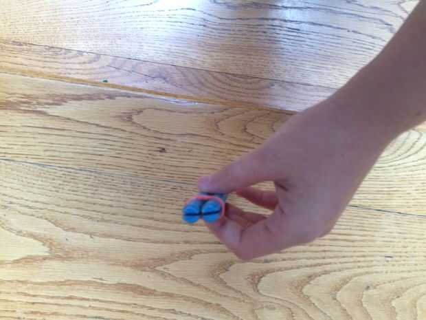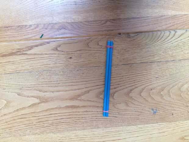 Tomar dos bandas de goma y conecte las dos varillas azules para que las ranuras en los extremos de las barras de hacen una línea recta.