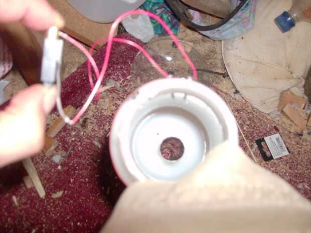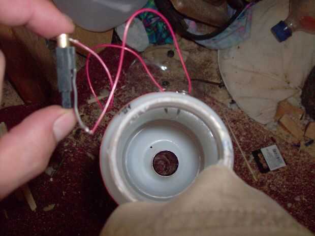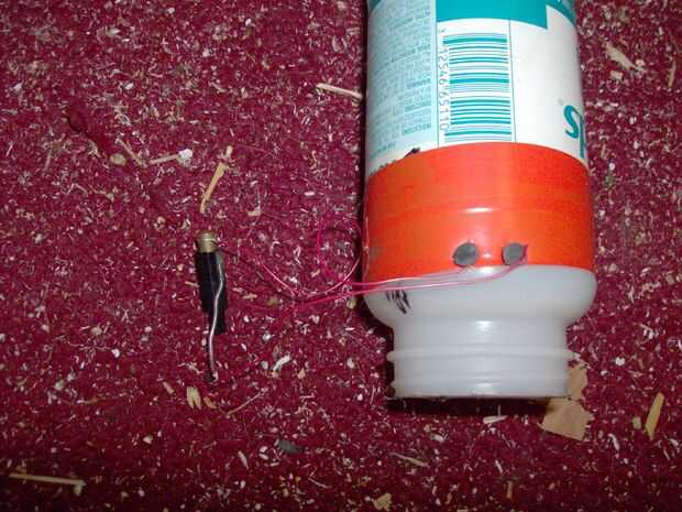 Luego coloque un pequeño trozo de cable a cada uno. Conecte el otro extremo de uno de los cables al cable que viene del interruptor de ignición eléctrico piezoeléctrico. El otro cable en la parte inferior del interruptor de bucle. Haga clic en el interruptor y Compruebe la chispa de los extremos puntiagudos de las tachuelas de alfombras dentro de la botella. Si usted no recibe ninguna chispa después de unos pocos clics, puede que necesite acercarse a las tachuelas.