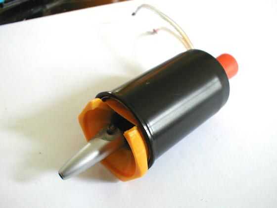 Por la ranura de corte en el barril para el conjunto de elemento en su lugar, decidí cubrir el tubo completamente, para asegurarse de que mis dedos no llegar a ninguna parte cerca de los mejores trozos de metal. Un cilindro de metal del cuello de una botella de vino firmemente montado sobre el cañón, seguido por un bote de película de plástico de 35 mm, con un orificio en la base de la vaina naranja caber a través.