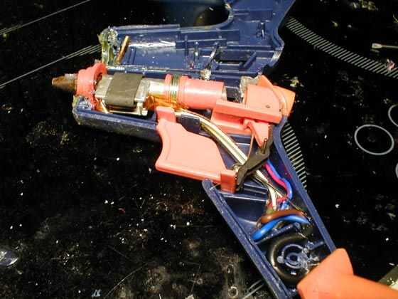 Dentro de la pistola encontrarás un buen montón de cosas, muchas de las cuales es el mecanismo del gatillo. No necesitamos esto, así que se puede sacar y dejar a un lado, junto con el caso sí mismo. No deseche el caso, ya que puede ser útil más adelante.