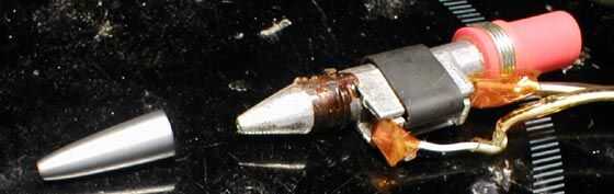 Dispone el envolvente de aluminio punta de un bolígrafo - con un agujero de diámetro más pequeño en el extremo - sobre la boquilla original de la pistola, fijándolo en su lugar con pegamento y, menos con sensatez, un pequeño tornillo y cinta envuelta alrededor de todo. No utilice el tornillo, a menos que usted puede hacer absolutamente seguro que no pegamento caliente se filtrará hacia fuera alrededor de él cuando esté bajo presión. Además, no utiliza soldadura, porque comenzará a derretir en cuanto calienta la boquilla.