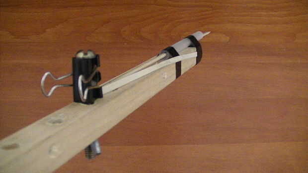 materiales: pluma tubo de goma, cinta, pinchos, tapasProcedimiento:1. Tome un tubo de lápiz, hacer tomando un bolígrafo y división aparte.2. Coloque una banda de goma hasta el final del tubo de la pluma, taping en.3. tomar una tapa e inserte en el ex