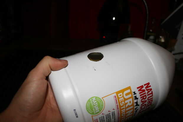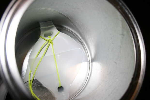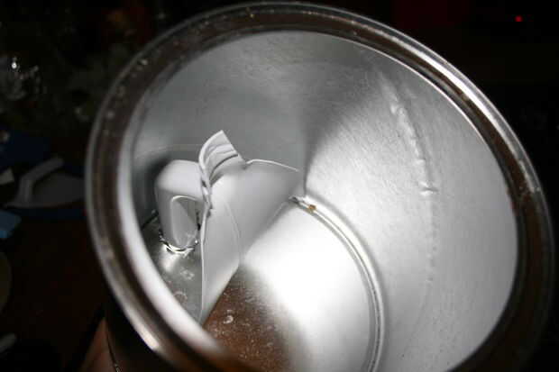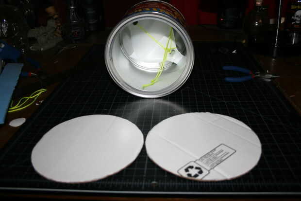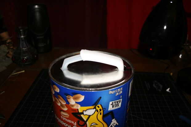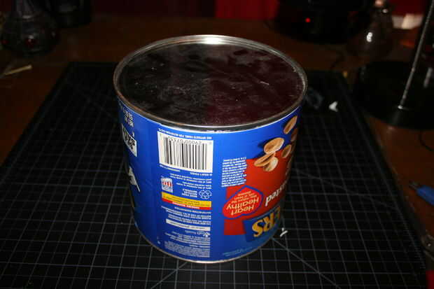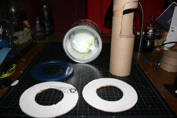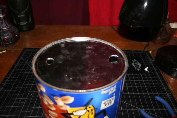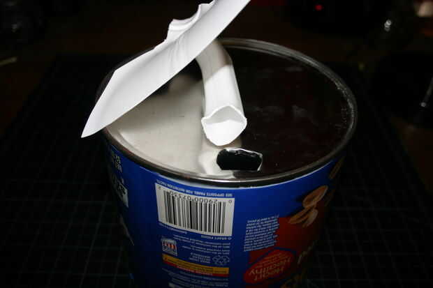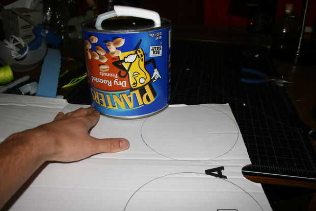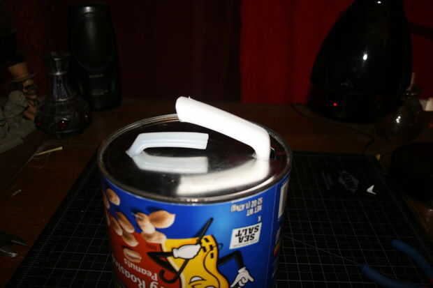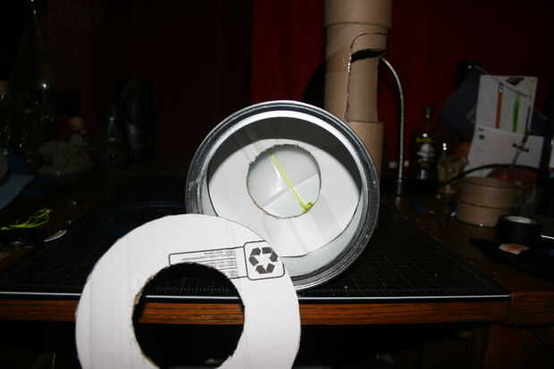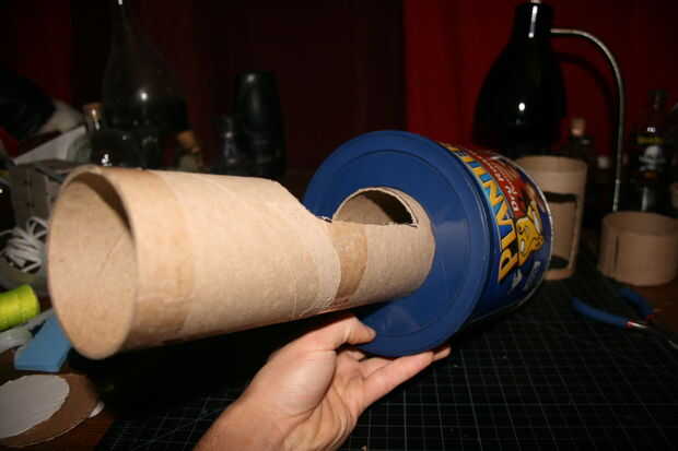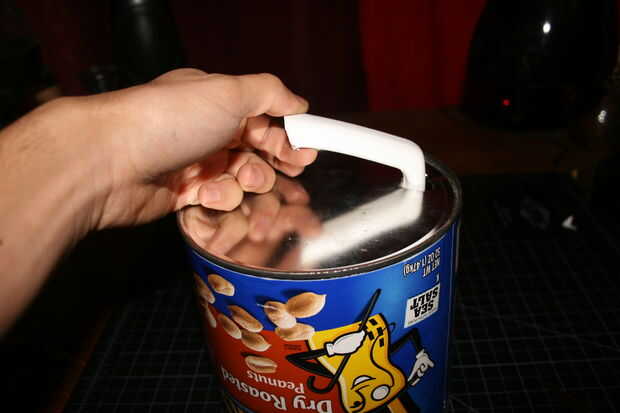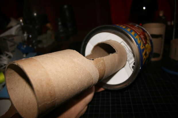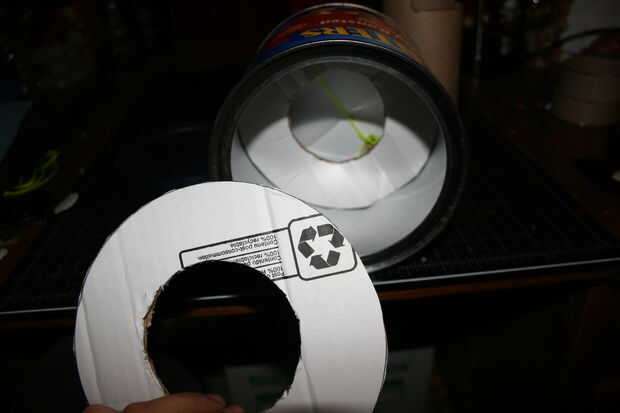 Cortar dos círculos de cartón corrugado tamaño de cacahuete puede. Corte un agujero a través de sus centros sobre el tamaño de su tubo de cartón. Estos dos anillos dentro de la lata de maní y cinta en lugar de la cuña. Podrá deslizar el tubo firmemente en el cacahuete puede y deje que se llevará a cabo en lugar por estos anillos de cartón.