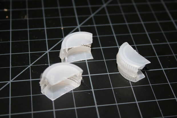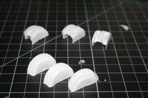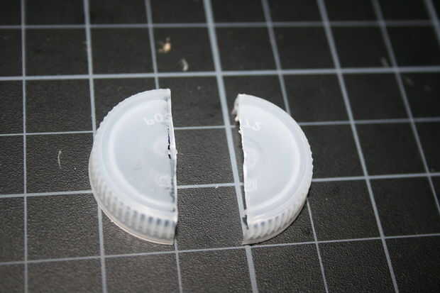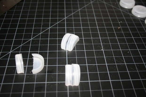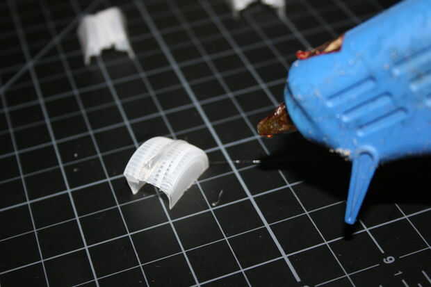 Tome sus cápsulas tres restantes y cortarlos por la mitad, justo al lado de centro. Esto debería dejar suficiente diferencia de tamaño que uno debe deslizarse dentro del otro, y los bordes de corte podrán descansar planos sobre el escritorio. Les pegan. Estas son las bisagras donde los brazos se unen a la pistola.