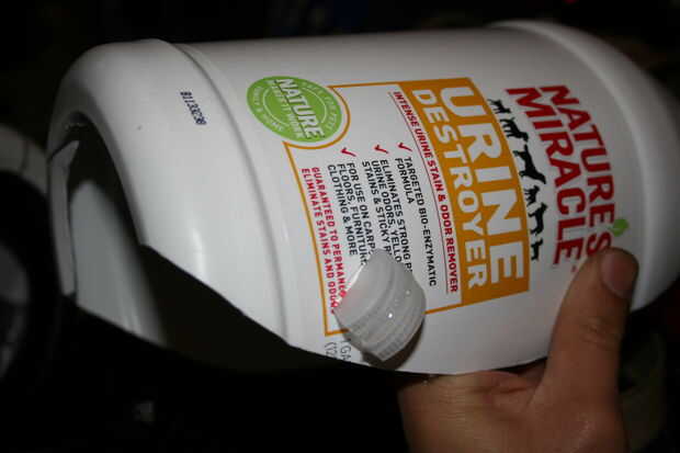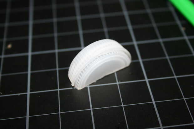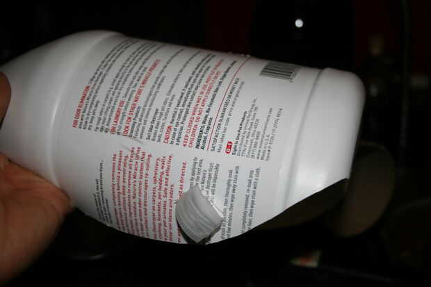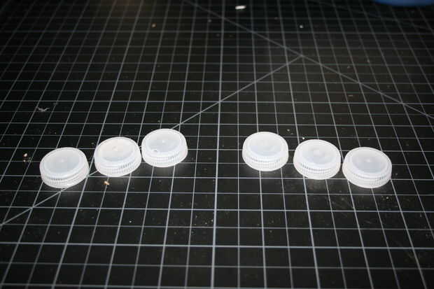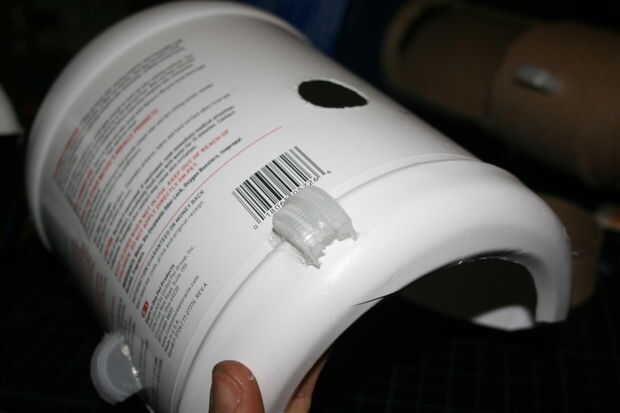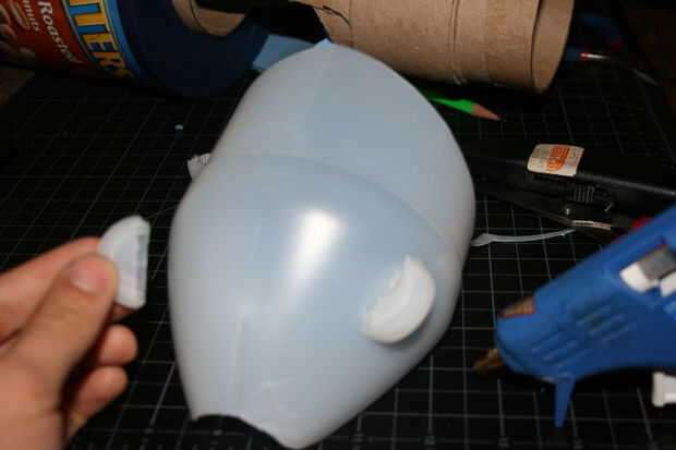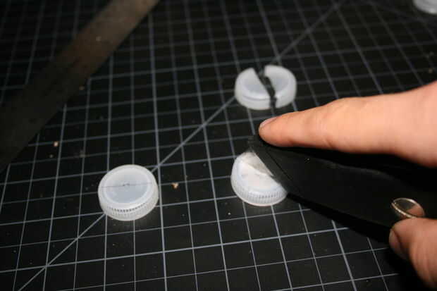 Encolado de las formas de la tapa de botella abierta en la jarra grande de plástico, una a cada lado y uno en la parte superior, en el lado derecho.