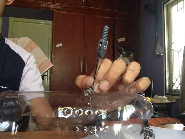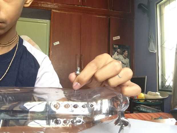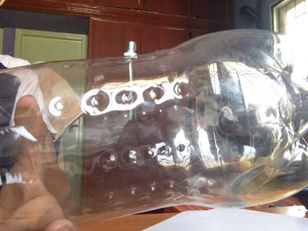 Hacer un agujero en la botella y poner el pin y luego uso un pegamento pistola para arreglarlo