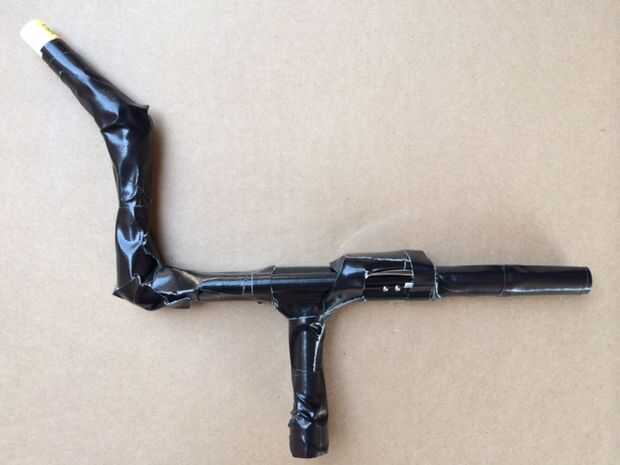Jugaba con el diseño en el explainer Howtoons, pero terminó con una versión más simple basada en video de amor específico donde él tira botellas de agua vacías. Después de probar algunas configuraciones, mover el tubo de soplado en la parte trasera y coloque la manija en el medio.