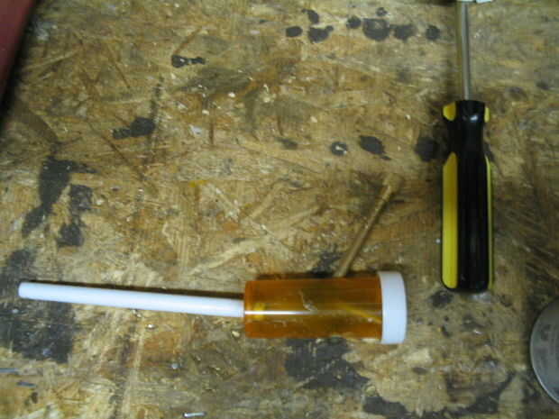 Paso 1: Tomar la botella de píldora y debe ser un todo en la parte inferior de la misma, el agujero de taladro del mismo diámetro que la pluma o tal vez un poquito más pequeño. Desea mantener el agujero pequeño para que cuando el cilindro entra se theres no mucho a buen ritmo alrededor de él.