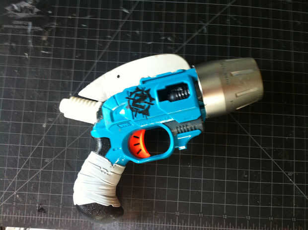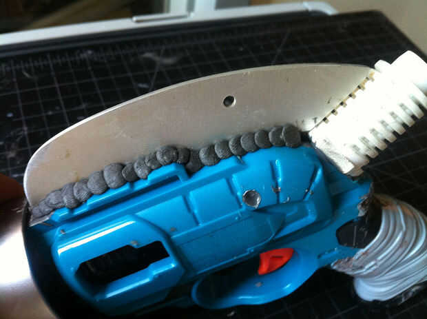 Tenía un trozo de aluminio de otro proyecto de la pistola de rayos, así que corte y lo formó para que quepa en el Nerf. Ajustaron en su lugar y dejarla sentarse durante la noche, luego con alguna masilla de JB Weld, el tipo que se corta y puré juntos, que he creado pequeñas bolas que luego de presionar en su lugar para crear una apariencia de soldado con autógena.