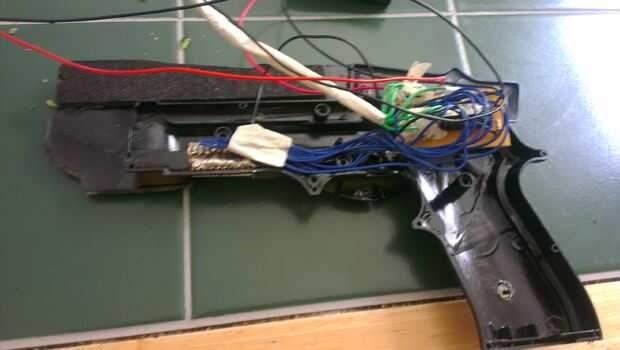 Una vez tengo todo y perforó mi agujero para el interruptor micro de la culata de la pistola... Debe ser visible en las imágenes aparece encima del logotipo. Me caliente pegan la pistola.
