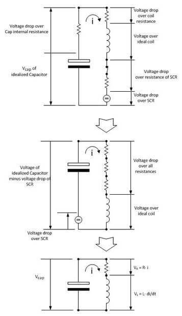 Después de encender el SCR, la tensión de la tapa es igualada por la tensión sobre las resistencias, internas y externas, además de la tensión sobre la bobina.