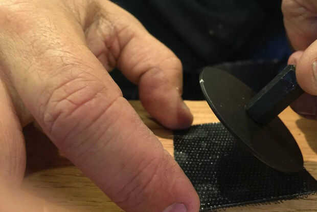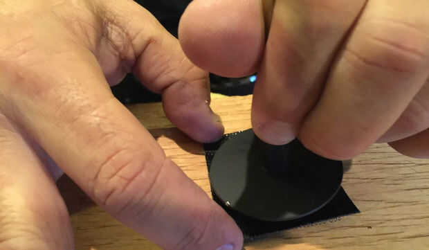 2" pieza cuadrada de Velcro autoadhesiva era corte del rollo y unido a las tapas de los discos. luego fueron cortadas con una navaja y una tijera. Este paso tendrá un poco de tiempo por lo que puede hacerlo frente al televisor mirando el último maratón de serie zombie violento de su elección.