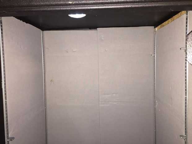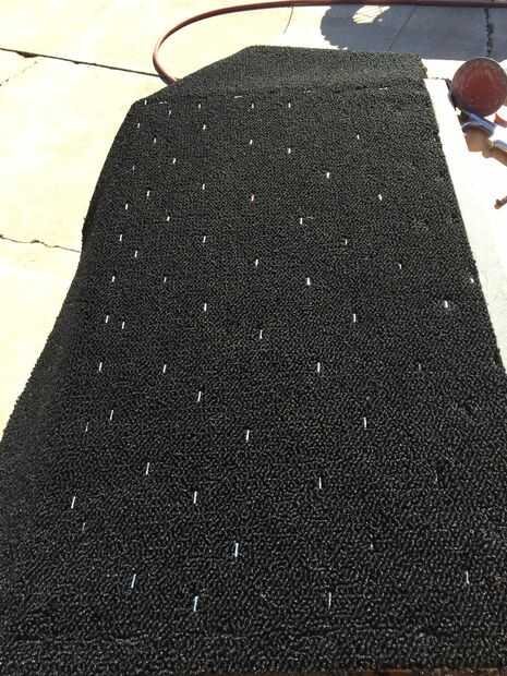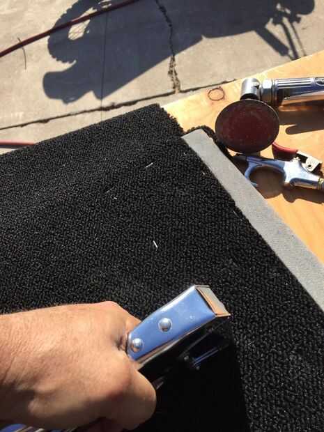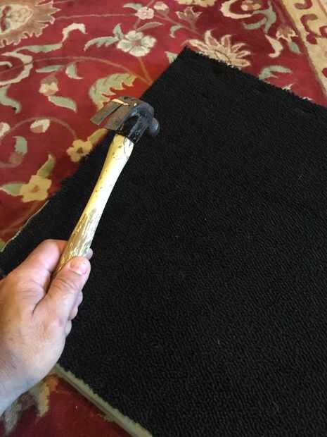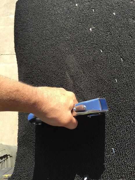 Vaciado mi seguridad al salir del estante superior. Una vez que salió, he volteado boca abajo y aplica la alfombra de bucle a la parte inferior de la plataforma para que los soportes de arma de fuego pueden ser velcro en la parte inferior de la plataforma. Había grapado la alfombra para el estante de madera con grapas de 1/2" en un patrón escalonado. Entonces martilló cada grapa abajo en la siesta de la alfombra.