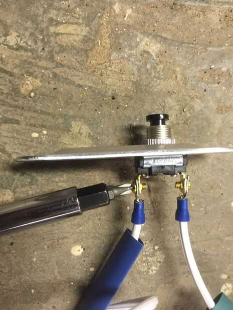 El cable a través de la parte inferior de la caja de pescado. Luego ponga un trozo de encogimiento del calor de la tubería en los extremos del cable con conectores de horquilla. Conecte los conectores de horquilla a los terminales del interruptor y las conexiones del encogimiento del calor.