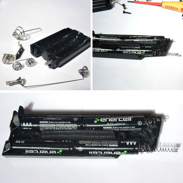 Los conductores que fueron expuestos en la parte superior de la revista necesitan una manera de hacer contacto con el resto del circuito dentro de la pistola, pero no podía ser duro con cable porque quería que el cargador sea extraíble. Para solucionar esto he usado resortes del portapilas de basura electrónica. Después de estirar los resortes para crear un contacto alargado eran caliente pegado en su lugar, haciendo que los extremos positivos y negativos de la matriz de la batería empujando la th etop de la revista, listo para el contacto con el circuito cuando se insertan en el cuerpo de la pistola.