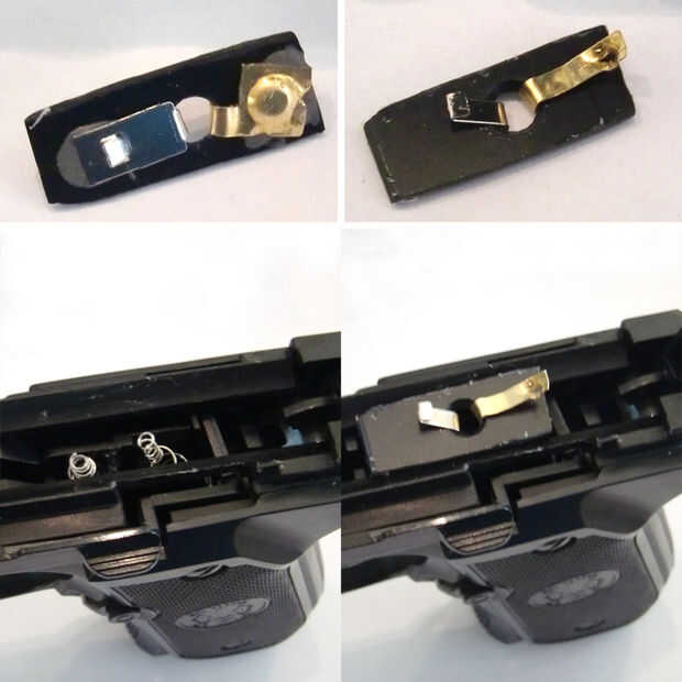 El lugar de perfil puede ahora colocarse dentro y encima de la empuñadura de la pistola entre la diapositiva, el perfil de la pieza de plástico tendrá que ser tallado abajo para caber. No pegar en el lugar todavía! A continuación, instale el cargador de la batería modificada y alinee la placa de contacto para cumplir con los resortes del compartimiento de batería. Seguramente habrá una modificación necesaria para el compartimiento de la batería y la placa de contacto para garantizar una conexión segura. Prueba su circuito antes de pegarlas en su lugar!