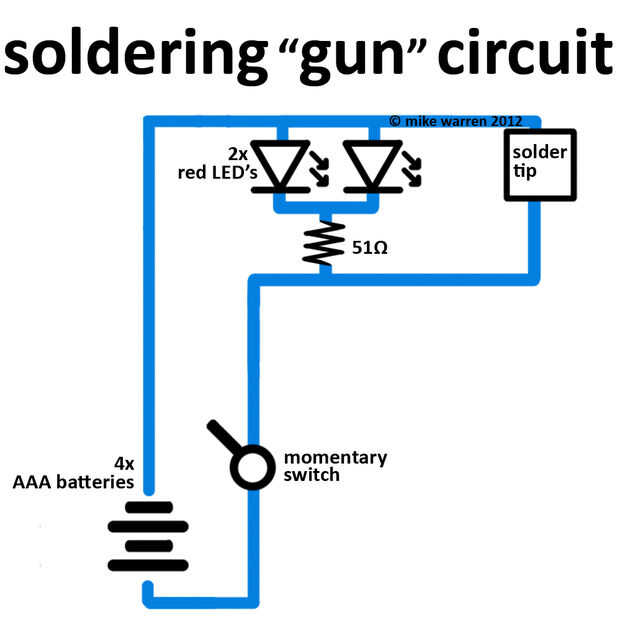 El cableado destacará sobre todo como estaba originalmente en el soldador, pero con la adición de un segundo LED (que una a cada lado de la diapositiva) y un interruptor momentáneo para operar la pistola de soldar en vez de interruptor de palanca de los fabricantes.