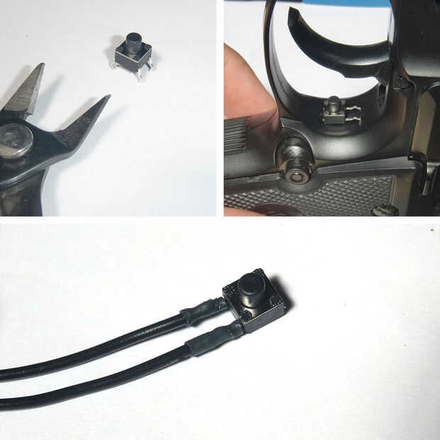 Dos cables eléctricos fueron soldados a un pequeño interruptor momentáneo y protegidos con tubería del encogimiento del calor. Opté por usar todo negro, ocultando así el interruptor para el observador casual. Después de soldar el interruptor se instaló con una resina de fuerte, se harto de los leds del interruptor detrás del gatillo en la pistola, emergen entre las diapositivas de la manija. Un extremo se suelda al cable negativo de la soldadura punta y la resistencia (ver paso anterior).