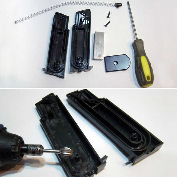 Una vez que su revista es eviscerado toma las 4 pilas AA y que encajen dentro, desea que el ajuste a ser ceñido, pero no para inhibir la revista cierre correctamente. He añadido un pedazo pequeño de 3mm de espuma dentro de la revista vivienda para mantener las baterías en su lugar y les impiden golpear.