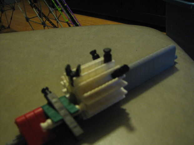es un simple arma decidí construirPaso 1: cuerpo Paso 2: gatillo La pieza blanca es la seguridad, la retirada cuando esté listo para disparar y enrosque el conector blanco/púrpura en el gatillo, por ello permitiendo que la corredera gatillo a través