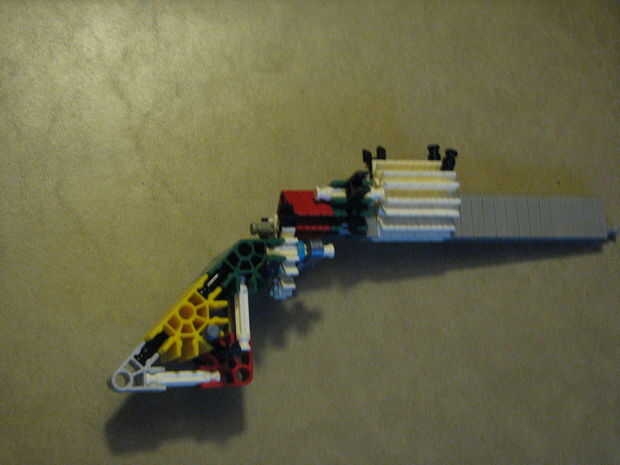 es un simple arma decidí construirPaso 1: cuerpo Paso 2: gatillo La pieza blanca es la seguridad, la retirada cuando esté listo para disparar y enrosque el conector blanco/púrpura en el gatillo, por ello permitiendo que la corredera gatillo a través