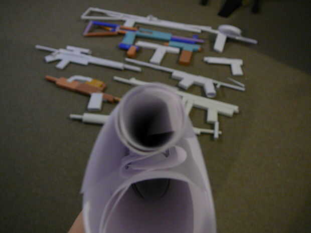 esta es mi arma de papel está hecho de cinta y pegamento caliente de papel de impresora muy fácil de hacer y tira duro!!!!!!Pros:Dispara rápidoFácil de hacerNo que muchos materialesNo tomar por siempreContras:Duele si te disparen