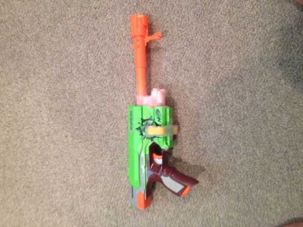 Hola chicos, quería compartir esta cool pistola escopeta poco que hice contigo. Tiene un asa muy cómodo y un ram de doble. También cuenta con un pequeño 'aleta/tapa' que usted la película con el pulgar, que se revela en el interior del cañón, por lo