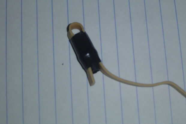 Poner la goma en como esta, con la cinta, ser shure a tire de la cinta firmemente cuando rapring. Cortar la goma extra.