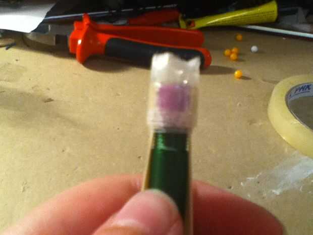 2Lleve el caucho banda tke el lado cortado de la goma elástica y cinta adhesiva en la parte delantera de la pistola (el lado de oposit desde el lado donde se pone la tinta)