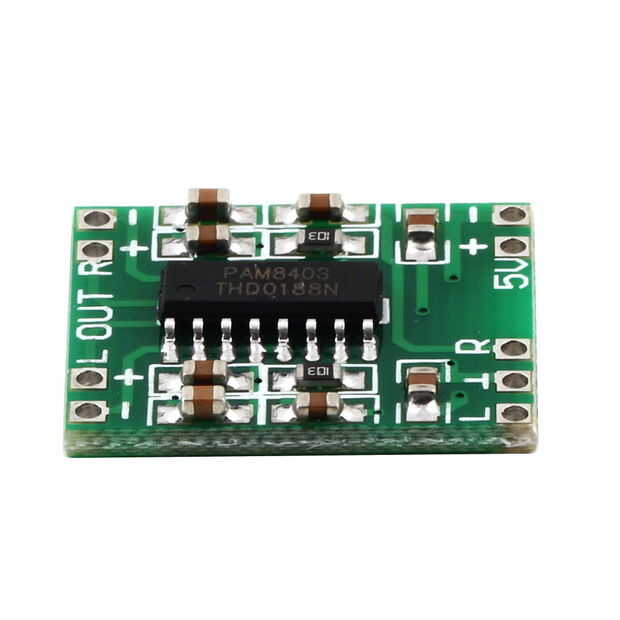 Compré un módulo de amplificador estéreo clase D 5 voltios en Ebay por menos de un euro. Pueden entregar hasta 3 vatios por canal, y aquí estamos utilizando un único canal. El amplificador es construir alrededor de un chip de PAM8403. Es sorprendentemente potente y corre bien en la celda de LiPo.