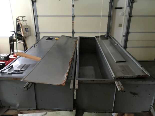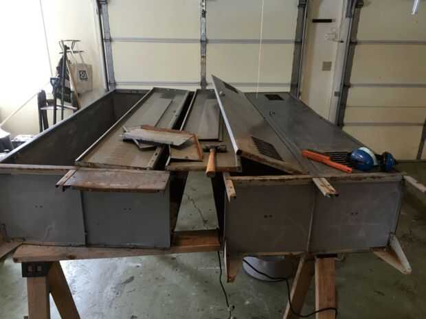 Empezamos a ser quitar todos los estantes, ganchos y retroceso de placas. Después de muchos años de abuso esto fue un poco más difícil de lo contrario habría pensado. El problema principal era que las tuercas y los pernos habían oxidado apretados y con los tornillos tienen una cabeza redonda, cónica no había nada que un asimiento del gancho agarrador.