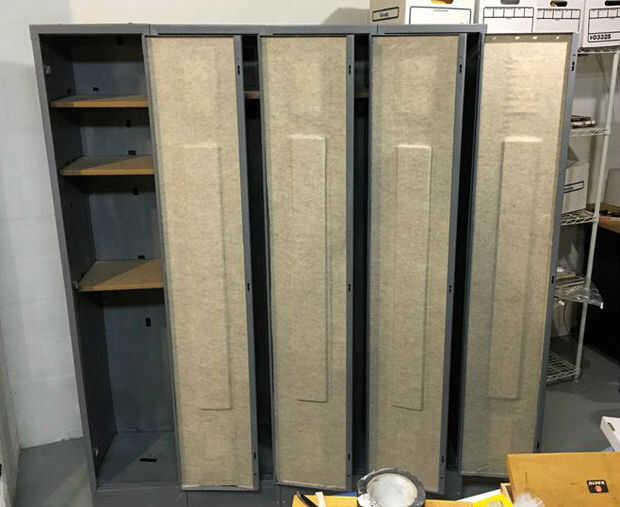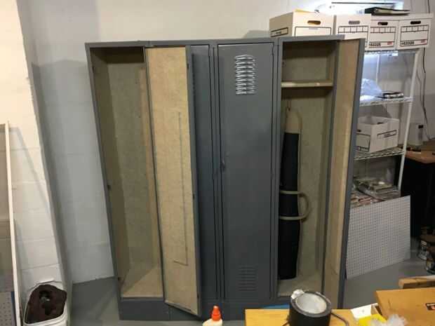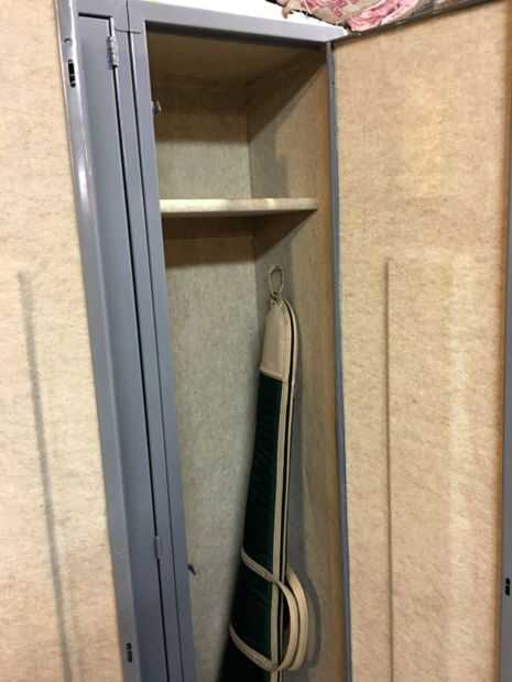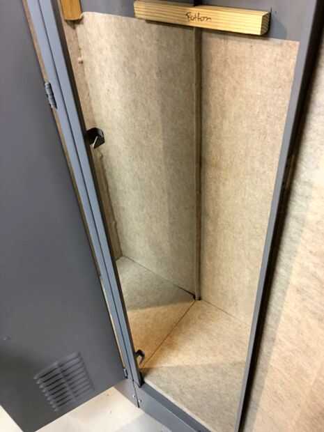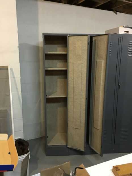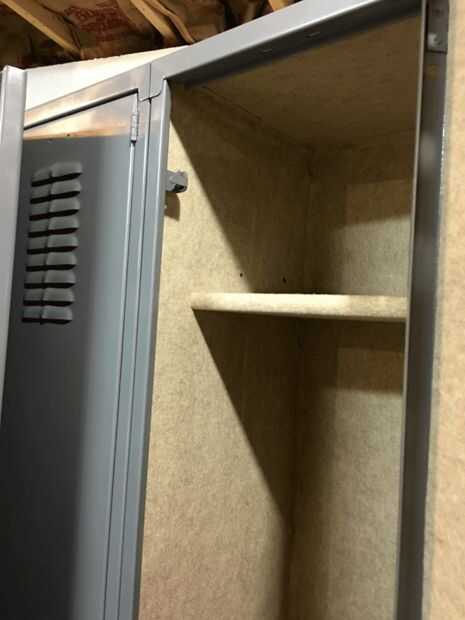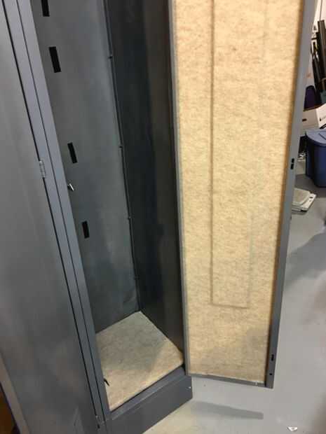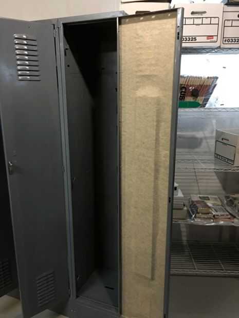 Aquí es otro. El interior de la máscara deslizante de apertura de puerta en cada casillero. Hay una pieza de metal, la altura de la puerta, justo detrás de la palanca de apertura. Esto tiene que deslizarse hacia arriba y hacia abajo fácilmente. Si usted pega cerrado o algo consigue pegado a él la puerta no se abrirá. Una vez más, el amigo me dijo...