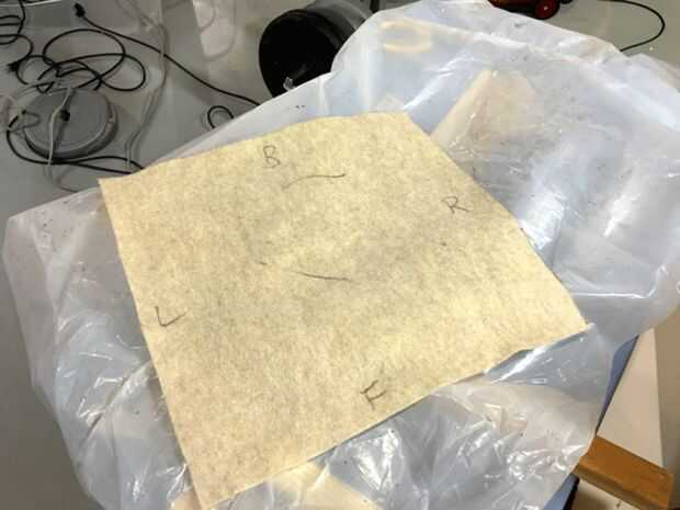 Cuando marqué el fieltro para las líneas de corte usé un marcador permanente con el borde recto. También marcó por el lado de "pegamento" (mismo lado que el lado marcado) con el mismo lápiz para no confundir a los dos lados. Siempre quise al lado del marcador que el lado de la cola porque cuando corte las líneas de un bit de marcador mostraría en un lado o el otro o ambos. De esta forma que cualquier marcas ocultar siempre.