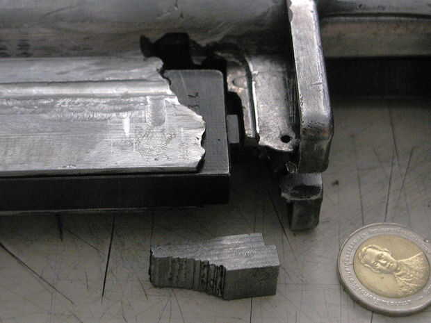 Así que molido hacia fuera el lado placas hacia lo suficiente para poder asiento nuevas piezas de metal en ellos. Tallado hacia fuera un reemplazo para el extremo de la broca ranurada (básicamente, todos los bits que tienen vaporizados por el cortador del plasma del BATF). Luego muele abajo poco de placa de desecho para el mismo espesor de las placas laterales.