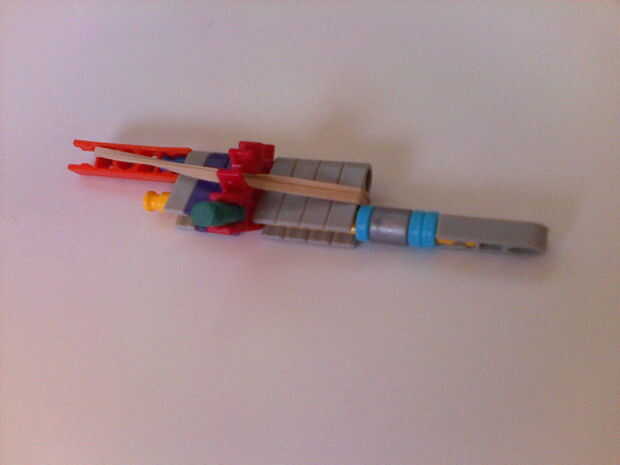 Al final poner el martillo en los agujeros de las piezas grises, luego doble la banda elástica y envuélvalo alrededor del arma.